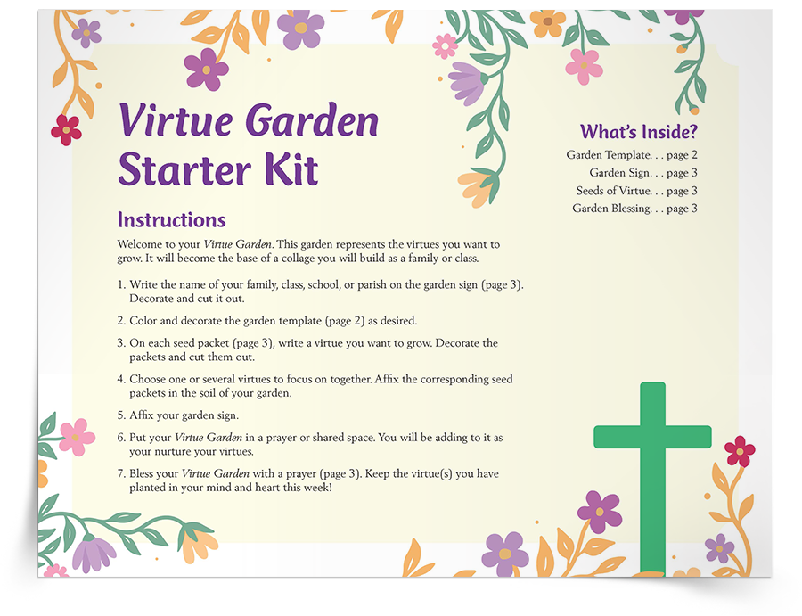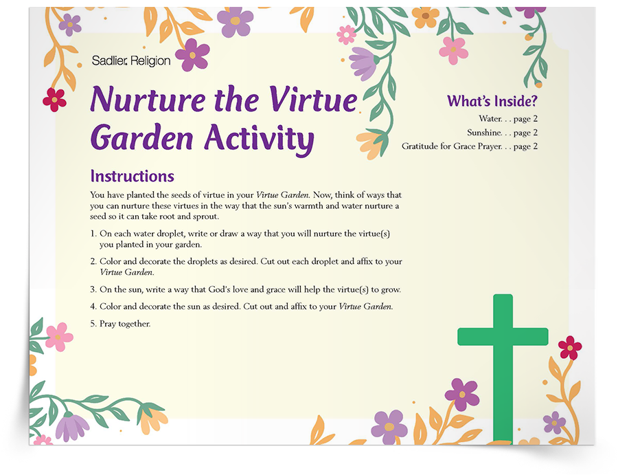 Lead children to reflect on what it means to be Catholic with this Invite kids and families to reflect on the ways that virtues are nurtured as part of Catholic family life. The Virtue Garden Activity encourages families to nurture virtues like patience and generosity as part of everyday faith life. Using a creative, hands-on garden activity, families “plant” and “grow” virtues over time with printable elements, representing how our choices help us grow closer to God and how virtues can blossom with care.
